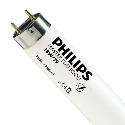 Philips TL-D Food are fluorescent tubes of 26 mm in diameter. These tubes are special because they can enhance food items, especially meat products. Philips TL-D Food 58W 79 - 150cm are fitted with a G13 base type, and measure 150 cm.